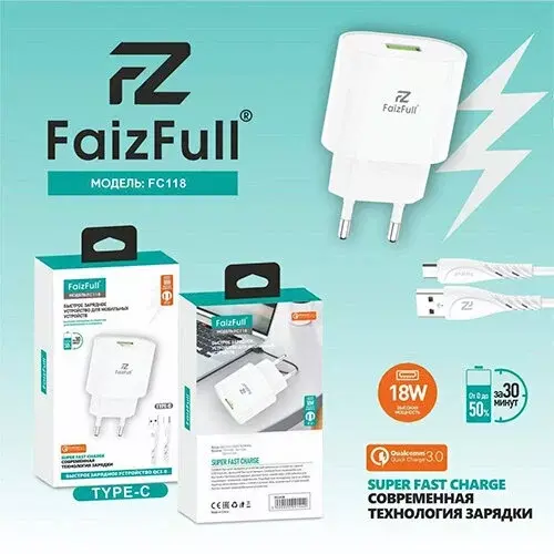 З/У сетевое FaizFull FC118 18W QC3.0 3A 1xUSB+ кабель Type-C